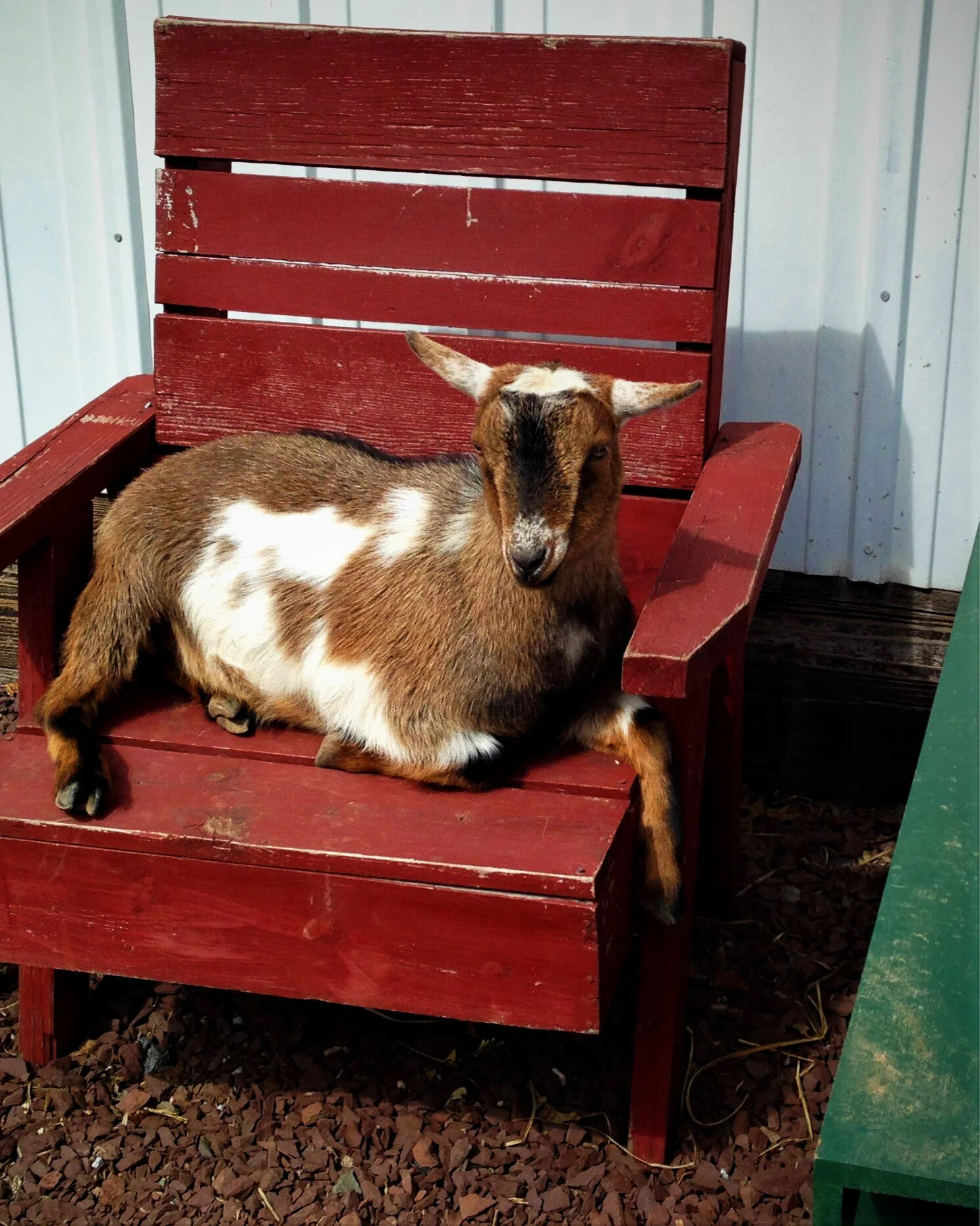 After that 3rd time Dijon stabbed the opportunity to get his own head stuck inside the metal can, we left him with it. He continued to be a goat, who wandered aimlessly into walls, gates, Crazylegs, brooms, and a watering can. Then his buddy Puzzle incited a head butting session, which we all thought was interesting from Puzzle’s point of view in that he would be bashing his head against a metal can, but then again, he is also a goat, so…? Dijon obliged the head sparring, clanking around and hitting the can helmet onto to Puzzle and anything else that managed to be in his path. Regrettably there is no video of this sequence with “the can”.